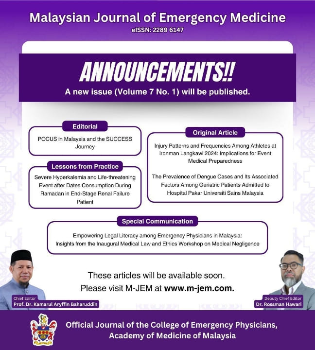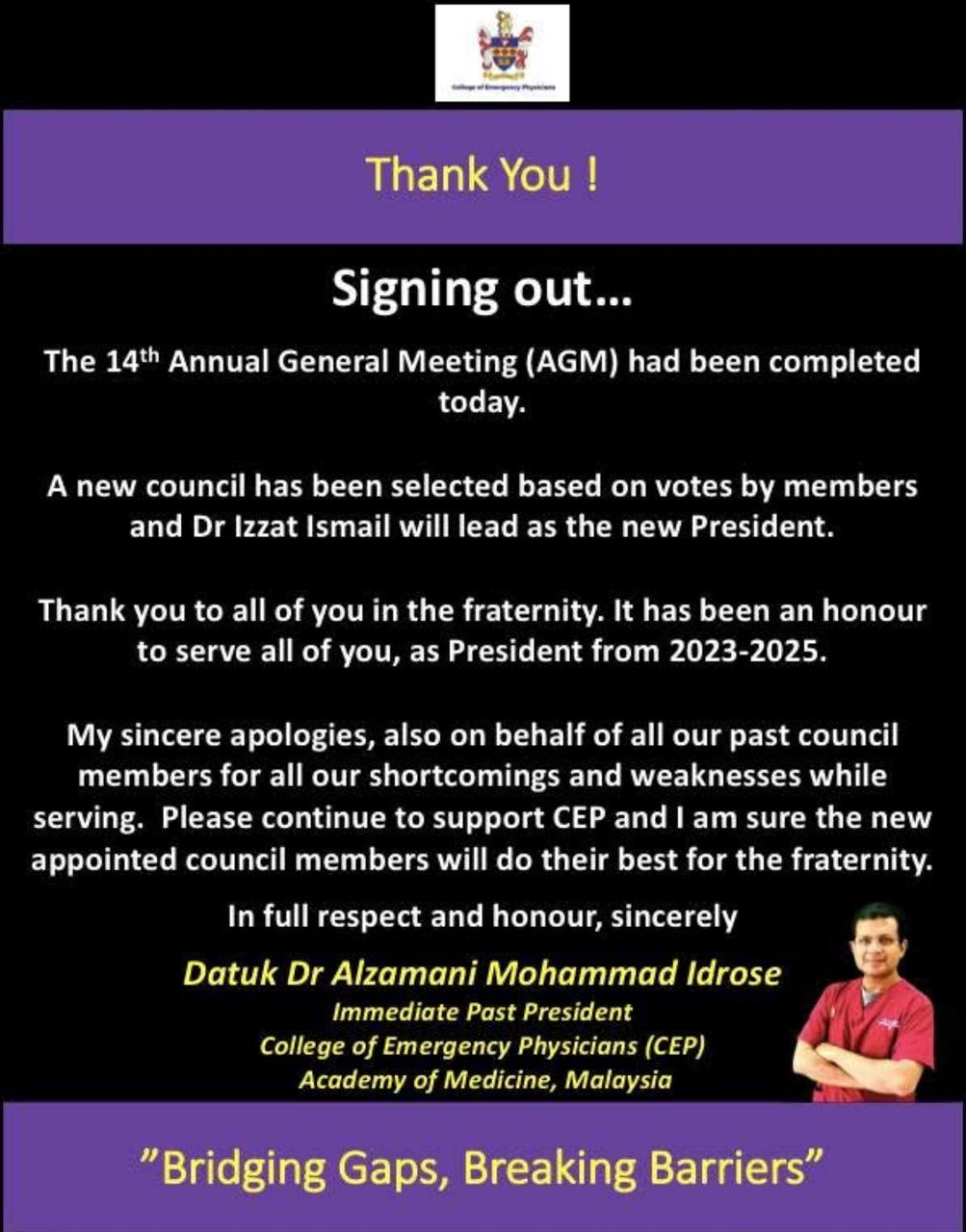 We have very interesting projects lined up and for these, we shall need dynamic and strong members to come join in the taskforces or teams set up. We invite all of you in the fraternity of emergency medicine in Malaysia to come join us and be part of the team. This is how we make our presence felt and be the ones who ‘make things happen’.